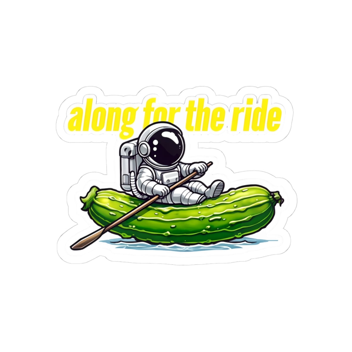 This absurdly delightful vinyl sticker features an astronaut calmly rowing a cucumber like a kayak under the words “Along for the Ride.”