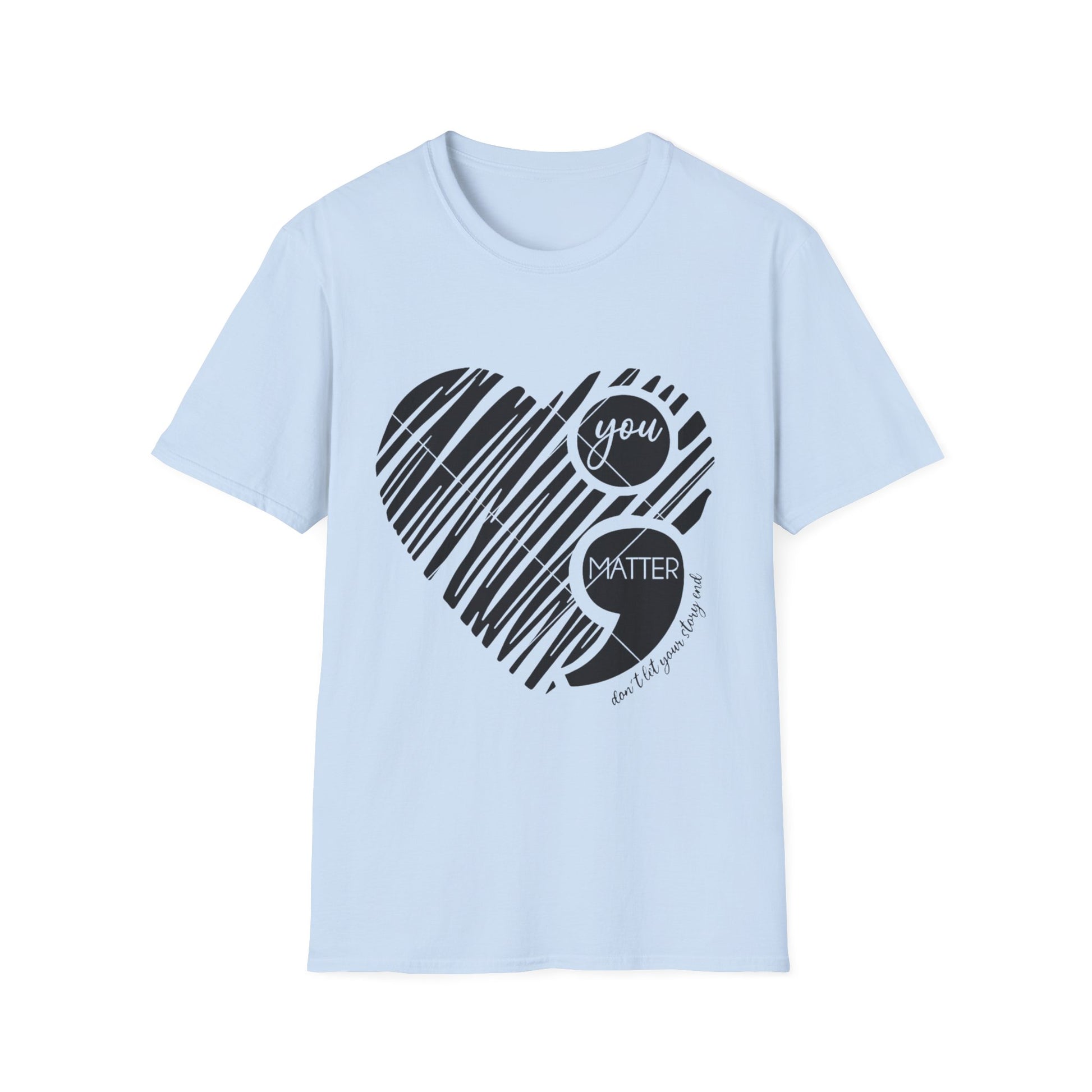 Wear your reminder and spread the message: You Matter ; This powerful semi-colon design stands as a symbol of resilience, hope, and continuing your story—making this tee more than just fabric, it’s a statement.